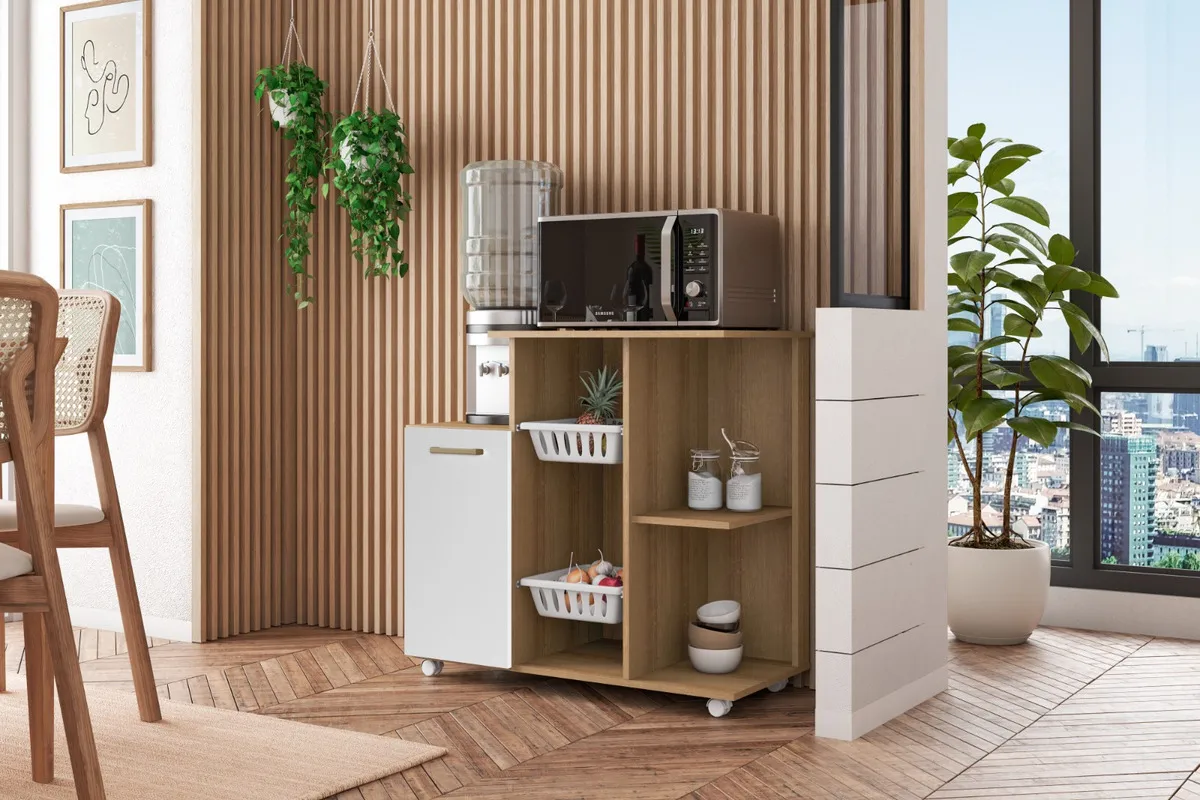Balcão para Micro-ondas com Fruteira e Rodízios — ideal para deixar sua cozinha mais organizada e funcional. Este armário multiuso conta com cestas em PVC para frutas, espaço para micro-ondas e filtro d’água, além de prateleiras de canto para utensílios e mantimentos. Possui porta com bom espaço interno e rodízios, facilitando a movimentação e a limpeza do ambiente.