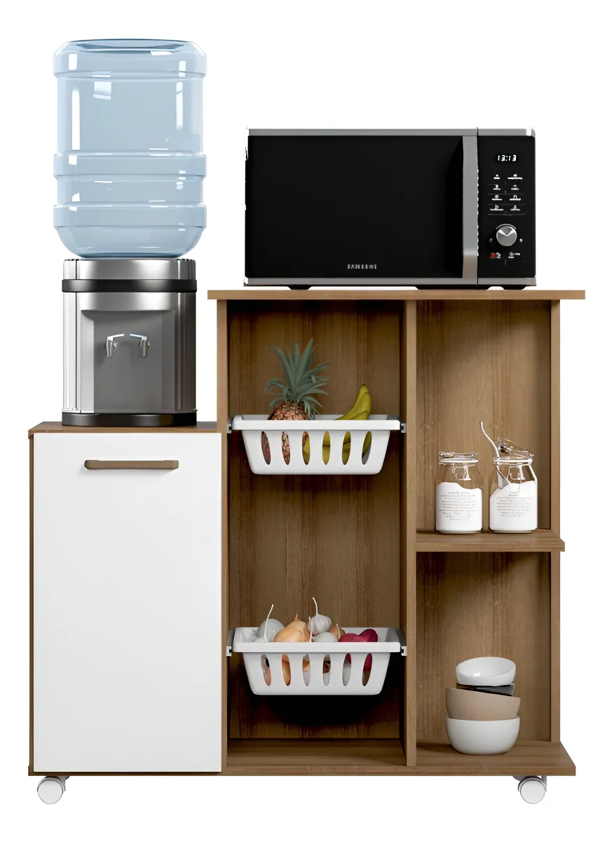 ideal para deixar sua cozinha mais organizada e funcional. Este armário multiuso conta com cestas em PVC para frutas, espaço para micro-ondas e filtro d’água, além de prateleiras de canto para utensílios e mantimentos. Possui porta com bom espaço interno e rodízios, facilitando a movimentação e a limpeza do ambiente.