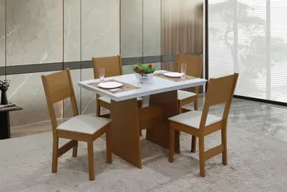 Perfeito para quem busca funcionalidade, conforto e um toque moderno para a sala de jantar. Com tampo retangular fixo, estrutura resistente e design elegante nas cores Cinamomo e Off-White, ele é ideal para ambientes compactos e acolhedores.