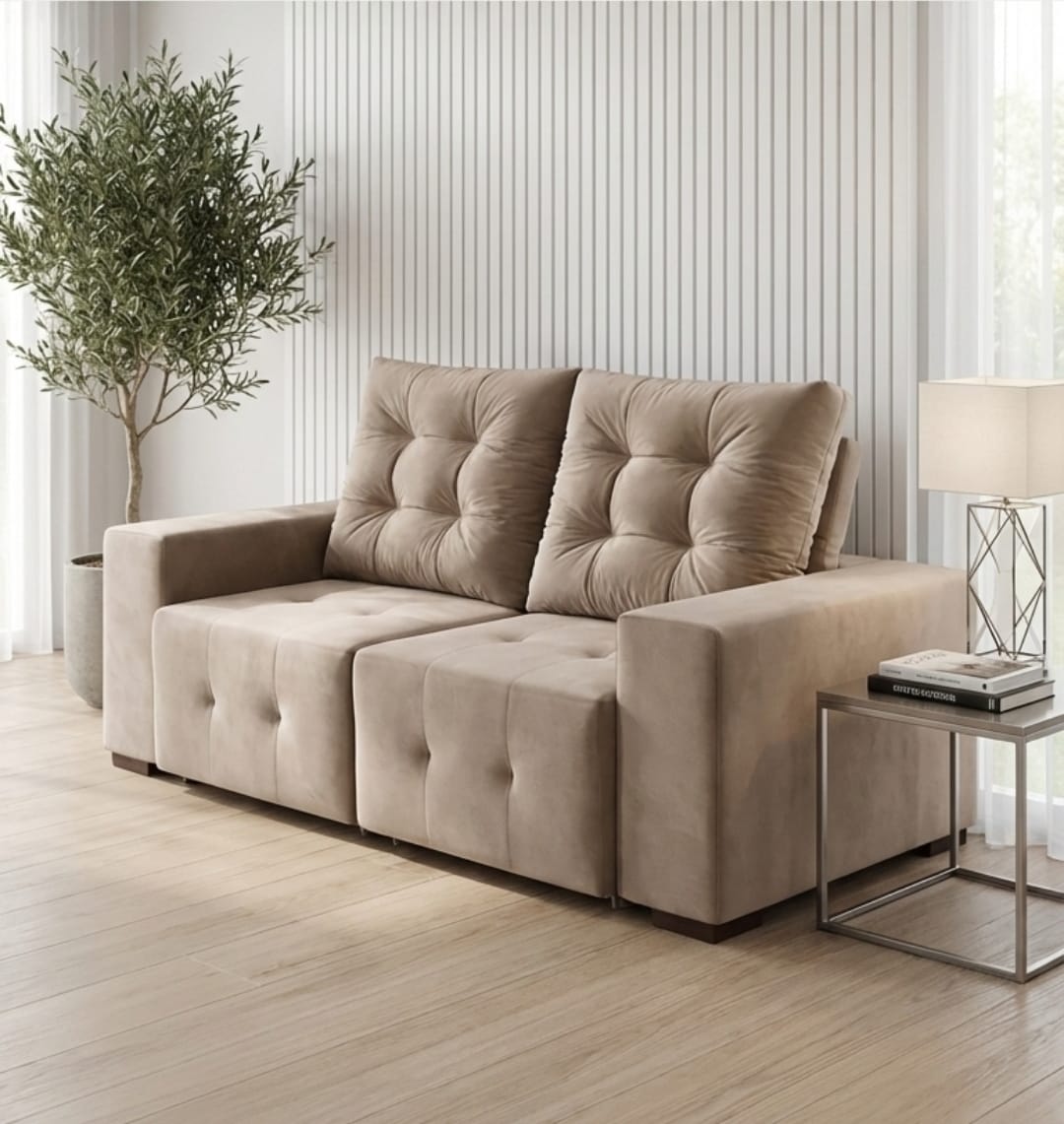 Sofá retrátil e reclinável de 1,80 m, ideal para salas compactas que precisam de conforto sem perder espaço. Possui assentos deslizantes, encostos reclináveis e acabamento em cor Castor, entregando praticidade e comodidade para o dia a dia.