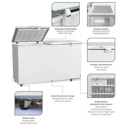 Freezer horizontal dupla ação de 503 litros, ideal para conservação de congelados ou refrigeração de bebidas, oferecendo alto desempenho e versatilidade. Conta com termostato ajustável, permitindo alternar entre congelamento e resfriamento conforme a necessidade.