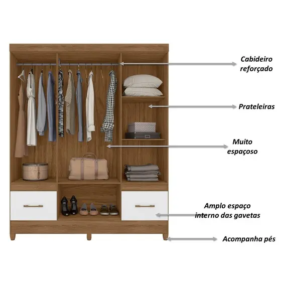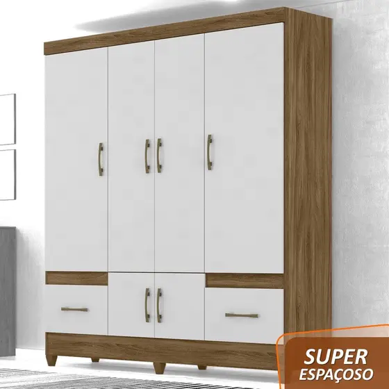As excelentes repartições possibilitam acomodar organizadamente roupas, edredons, travesseiros, calçados e objetos pessoais. Internamente contém cabideiros em madeira reflorestada revestida, prateleiras e duas gavetas espaçosas com corrediças metálicas, tudo para facilitar seu dia a dia. As 6 portas possuem puxadores de ABS e dobradiças metálicas.